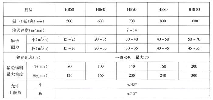 HB型鏈板、鏈斗式輸送機主要技術(shù)參數(shù)